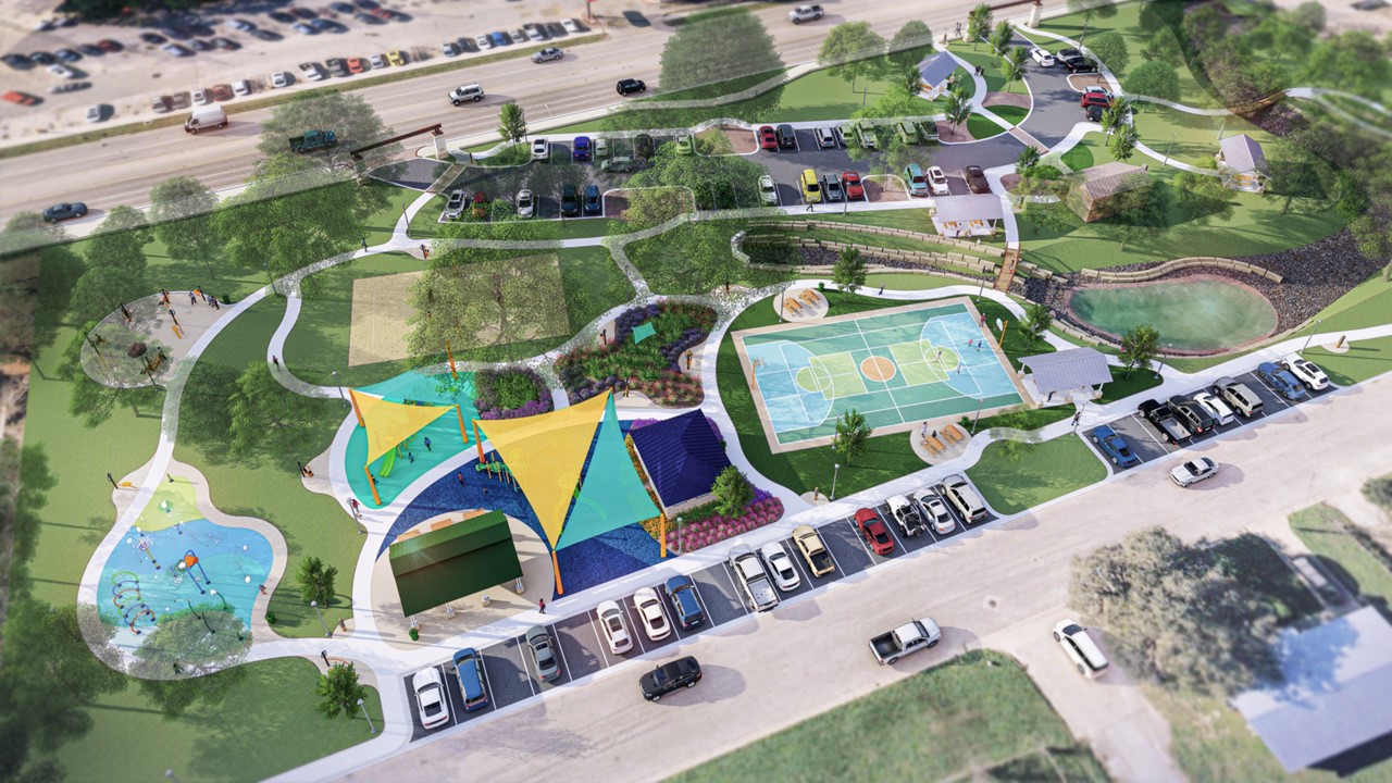 Conceptual rendering from the Lion’s Park Master Plan in Lockhart, Texas, illustrates the community-driven vision for revitalizing the historic park, which provides opportunities for recreation in years to come.